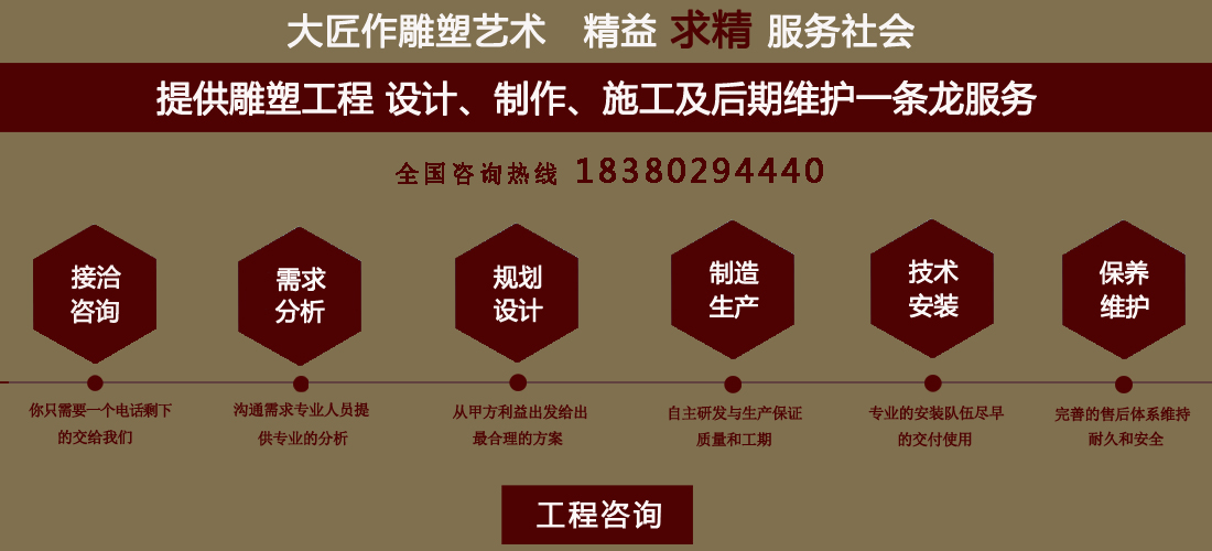 成都大匠作雕塑有限公司,是經(jīng)成都工商局審定注冊(cè)的正規(guī)專(zhuān)業(yè)雕塑制作及工程安裝服務(wù)機(jī)構(gòu),是由一群年輕富有朝氣的年輕人創(chuàng)辦,發(fā)軔于四川省成都市龍泉驛區(qū)。它是一家******于創(chuàng)作、制作和銷(xiāo)售為一體的公司。大匠作擁有多年從事公共藝術(shù)的專(zhuān)業(yè)人員和雕塑制作人組成的核心團(tuán)隊(duì),為您提供專(zhuān)業(yè)、具創(chuàng)新的設(shè)計(jì)及制作服務(wù)。公司成立以來(lái),秉承“******服務(wù)、誠(chéng)信為本”的宗旨,以客戶(hù)需求為目標(biāo)導(dǎo)向,不斷學(xué)習(xí),進(jìn)取,優(yōu)化和提高服務(wù)質(zhì)量,公司向您******——“您的滿(mǎn)意***是我們的信譽(yù)”,我們將以飽滿(mǎn)的熱情和******的服務(wù)贏(yíng)得您的贊譽(yù)和支持。 愛(ài)心,細(xì)心,耐心,責(zé)任心是我們的要求,盡心盡職,為您打造出創(chuàng)新、專(zhuān)業(yè)、******的設(shè)計(jì)方案,我們堅(jiān)信先做人、后做事,用心對(duì)待客戶(hù),實(shí)行透明收費(fèi),人性化服務(wù),本著對(duì)客戶(hù)負(fù)責(zé),對(duì)客戶(hù)負(fù)責(zé),更是對(duì)自己發(fā)展負(fù)責(zé)的態(tài)度,爭(zhēng)取做到讓每位客戶(hù)滿(mǎn)意